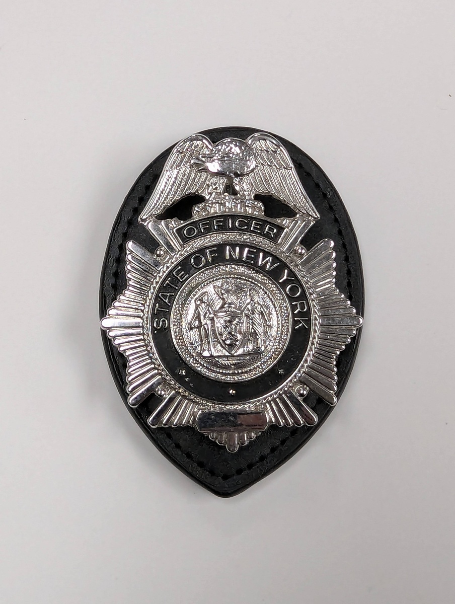 Replica police badge ideal for costumes or themed decor. Features a silver-toned design with intricate detailing.
