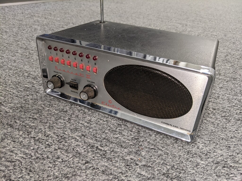 1980s vintage police scanner radio. Ideal for collectors or display in a retro-themed room. Made of metal and plastic.